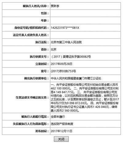 据中国执行信息公开网公布,贾跃亭因违反财产报告制度,未全部履行生效法律文书确定的义务,被北京市三中院列为失信被执行人。立案时间为9月28日,信息发布时间为12月11日。