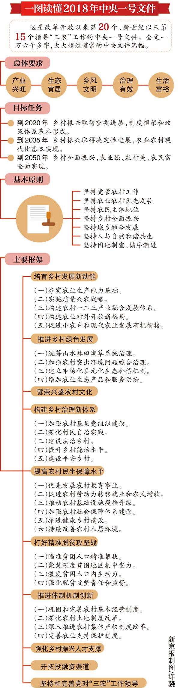 “今年的中央一号文件,全面贯彻党的十九大精神,以习近平新时代中国特色社会主义思想为指导,围绕实施乡村振兴战略讲意义、定思路、定任务、定政策、提要求。”中央农办主任韩俊说,“文件坚持问题导向,加快推进乡村治理体系和治理能力现代化,加快推进农业农村现代化,走中国特色社会主义乡村振兴道路,是谋划新时代乡村振兴的顶层设计。”