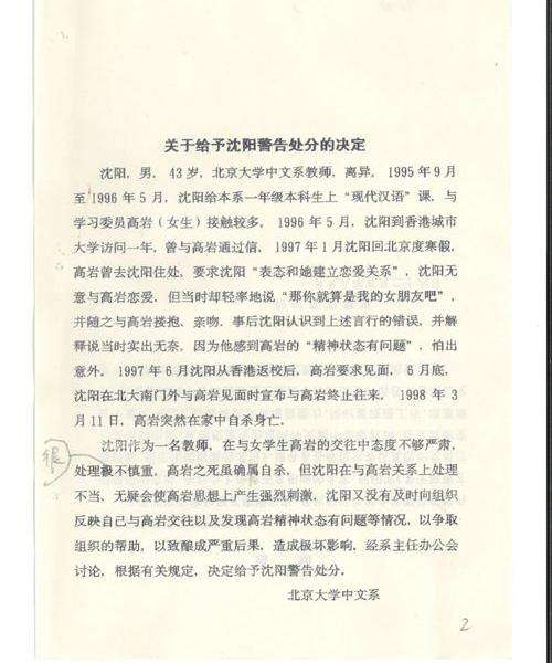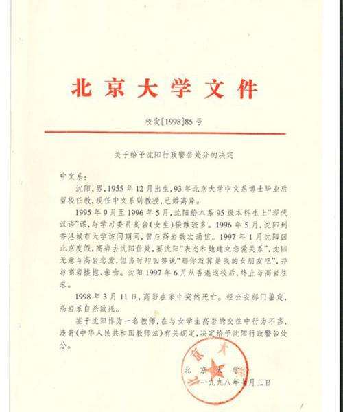 安钰峰通报了近期有关情况。相关网络信息出现后,学校高度重视,教师职业道德与纪律委员会按照要求进行复核工作,调取了当年的档案材料,向当事和参与处理此事的中文系与校纪委领导进行了解。经查,1998年初,北京市公安局西城分局治安处重大责任事故调查组对有关案件进行了调查取证,于1998年3月作出了事实认定,给出了调查结论,其中涉及到沈阳行为不当、违反师德,同年7月,中文系依据公安机关提供的相关事实和调查结论,决定给予沈阳警告处分,并报学校批准,随后在中文系召开全系教师大会,通报了学校和中文系的处理决定。