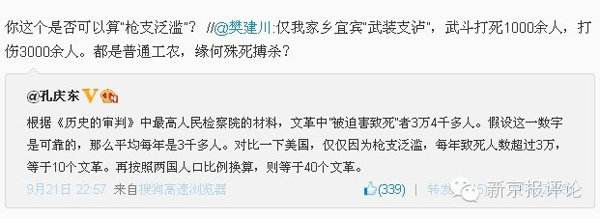 在孔庆东上述微博的转发跟帖中,沈彬提出一个疑问:“美国涉枪死亡是3万人,但孔庆东不会告诉你的是,这其中2万是用枪自杀的!中国人自杀还主要用农药,你怎么不说‘中国农药泛滥’?美国一年死于公路事故是4万人,你怎么不说‘美国汽车泛滥’?”