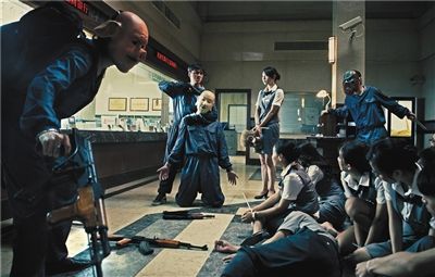 片头引子这场抢劫戏,无论是人物形象设计,节奏的把控,还是氛围的营造,都可圈可点,面具的使用尤为出彩。劫匪老大的血性狠劲与年画娃娃的微笑形成极具张力令人惊悚的反差,孙悟空、猪八戒的面具也都在其后的情节中起到相当重要的作用。