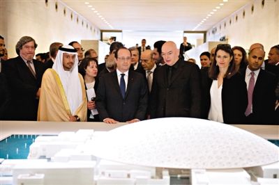 4月29日,法国总统奥朗德(中)和阿布扎比文化遗产委员会主席苏尔坦亲王(左)一起观看“阿布扎比卢浮宫”建筑模型。卢浮宫计划打造“阿布扎比卢浮宫”,以推广法国文化。
