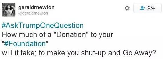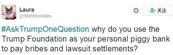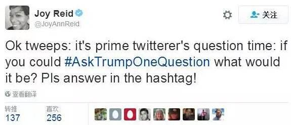 美国MSNBC的记者、政治评论员Joy Reid昨天在推特上发起了一个#Ask Trump one Qeustion#(问川普一个问题)的话题: