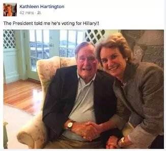 这个消息由肯尼迪总统的侄女肯尼迪·汤森女士公布在Facebook上。汤森配上一张和老布什的合影说,总统告诉我,他会投票给希拉里。