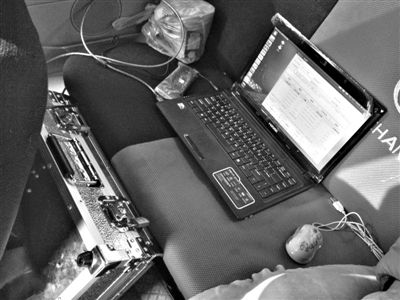 “设备在这儿。”郭鹏指了指后排座下面,一个长宽约40厘米、厚约15厘米的金属箱。他从座位下摸出两根数据线,一头插在金属箱预留的两个小孔上,另一端与笔记本电脑相连。