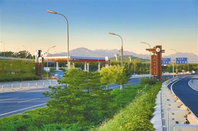 “雁栖风情大道”的巨大门柱耸立在京加路两旁。