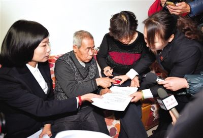 昨日,内蒙古高院副院长赵建平(左)向呼格吉勒图父母转交高院院长胡毅峰个人慰问金3万元。 新华社记者 任军川 摄