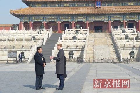 他选择了一条经典的故宫参观路线:从故宫西华门进入,沿中轴线依次参观了太和殿、中和殿、保和殿。威廉王子对古建筑很感兴趣,除了仔细听故宫工作人员的讲解,他还不时询问三大殿分别是什么含义,故宫修缮用了多久等等。