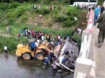 昨日15时45分许,吉林集安市凉水乡境内,延吉新世纪旅行社一辆大巴车坠桥,10名韩国人死亡。图/CICPHOTO