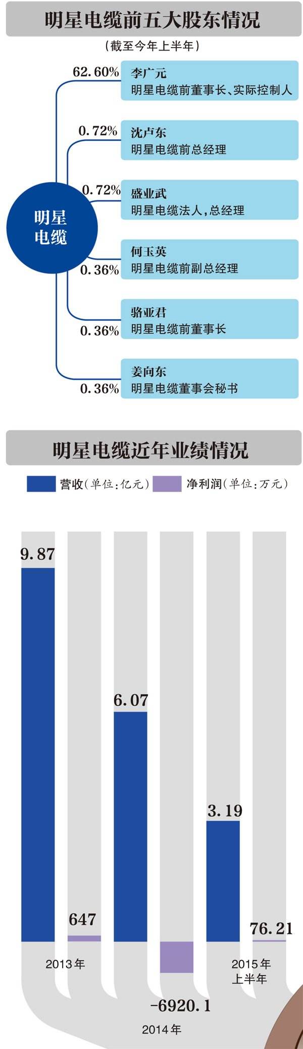 目前,李广元仍是公司的实际控制人。明星电缆2015年半年报显示,李广元持股3.255亿股,持股比例62.60%,为公司第一大股东。