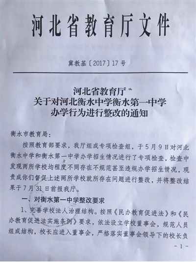 昨日,新京报记者获得一份名为《河北省教育厅关于对河北衡水中学衡水第一中学办学行为进行整改的通知》的文件。文件标号为冀教基[2017]17号,由河北省教育厅办公室印发于今年6月1日,文件中称“按照教育部要求,河北省教育厅组成专项检查组,于5月9日对河北衡水中学和衡水第一中学办学招生情况进行了专项检查,检查中发现两所学校程度不同存在不规范甚至违规办学招生情况。”