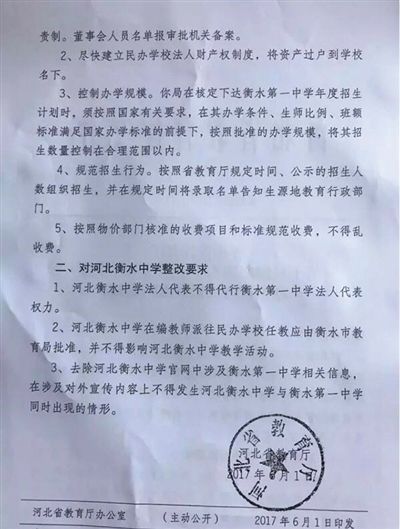 文件中,就完善学校法人治理结构、尽快建立民办学校法人财产权制度、控制办学规模、规范招生行为、不得乱收费等五项问题,面向衡水一中,以及“两校一法人”、公办在编教师任教民办学校、两所学校对外“捆绑宣传”等三项问题,面向衡水中学提出整改要求。