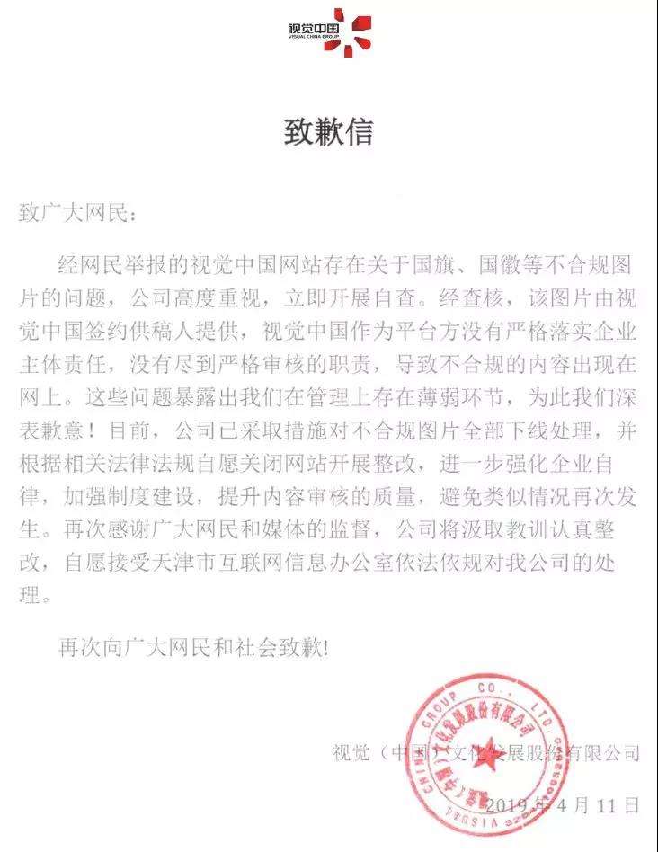 视觉中国在其官方微信发布整改通知,经网民举报的视觉中国网站存在关于国旗、国徽等不合规图片的问题,公司高度重视,立即开展自查。经查核,该图片由视觉中国签约供稿人提供,视觉中国作为平台方没有严格落实企业主体责任,没有尽到严格审核的职责,导致不合规的内容出现在网上。这些问题暴露出视觉中国在管理上存在薄弱环节,为此视觉中国深表歉意。目前,公司已采取措施对不合规图片全部下线处理,并根据相关法律法规自愿关闭网站开展整改,进一步强化企业自律,强化制度建设,提升内容审核的质量,避免类似情况再次发生。再次感谢广大网民和媒体的监督,公司将汲取教训认真整改,自愿接受天津市互联网信息办公室依法依规对本公司的处理。