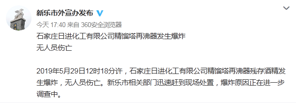 新京报快讯 据石家庄新乐市外宣办官方微博消息,2019年5月29日12时18分许,石家庄日进化工有限公司精馏塔再沸器残存酒精发生爆炸,无人员伤亡。新乐市相关部门迅速赶到现场处置,爆炸原因正在进一步调查中。