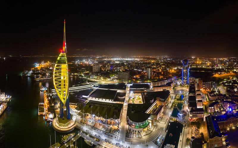当地时间6月3日,英国朴茨茅斯,当地地标大三角帆塔(Spinnaker Tower)点亮纪念灯光,纪念诺曼底登陆75周年。图/视觉中国