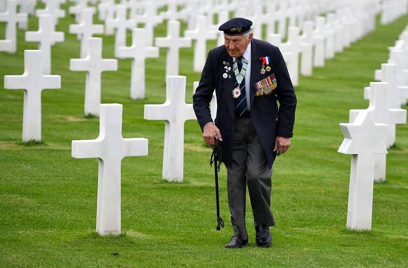 当地时间6月4日,法国卡尔瓦多斯,诺曼底登陆75周年纪念日将至,二战老兵访问诺曼底士兵公墓。图/视觉中国