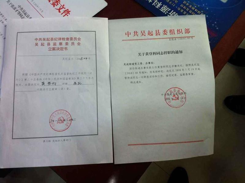 2018年4月,杨登科将举报内容发布在网络上,当年下半年,此事引发关注后,吴起县委组织部下发《关于黄登科同志停职的通知》,文件中写到“吴起街道办事处副主任黄登科同志涉嫌违纪,即日起停职,接受县纪委监委审查”。