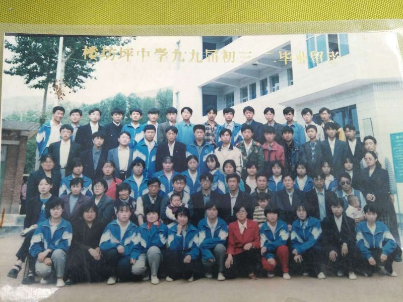 杨登科家中存放着他从小学到大专的毕业合影、各类证书,甚至还保留着写着“楼坊坪中学”的校徽。其中,1999届初三二班的毕业照里,倒数第二排左五就是杨登科。