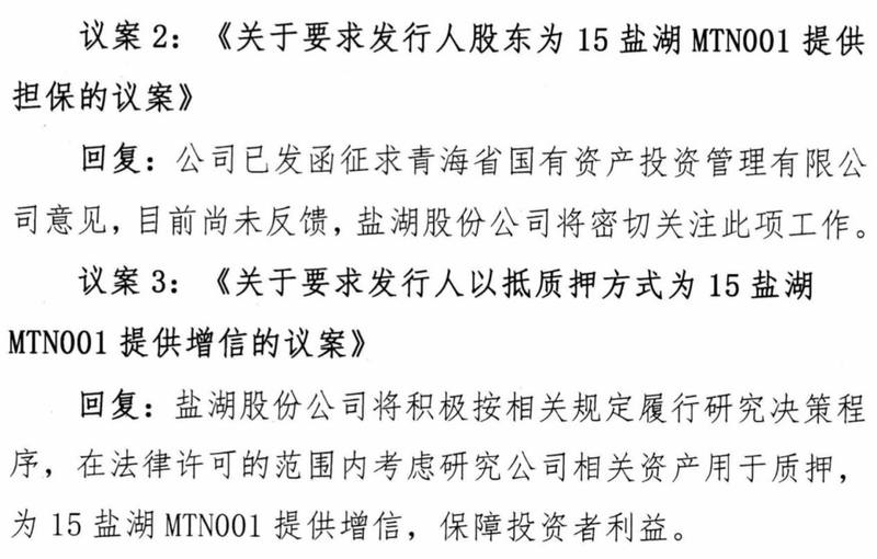对于议案3《关于要求发行人以抵押方式为15盐湖MTN001提供增信的议案》,盐湖股份回复称,盐湖股份将积极按照相关规定履行研究决策程序,在法律许可的范围内考虑研究公司相关资产用于质押,为15盐湖MTN001提供增信,保障投资者利益。