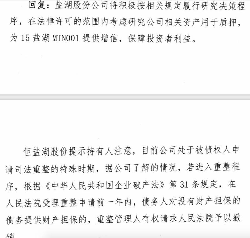 但盐湖股份提示持有人注意,目前公司处于被债权人申请司法重整的特殊时期,据公司了解的情况,若进入重整程序,根据破产法规定,在人民法院受理重整申请前一年内,债务人对没有财产担保的债务提供财产担保的,重整管理人有权请求人民法院予以撤销。