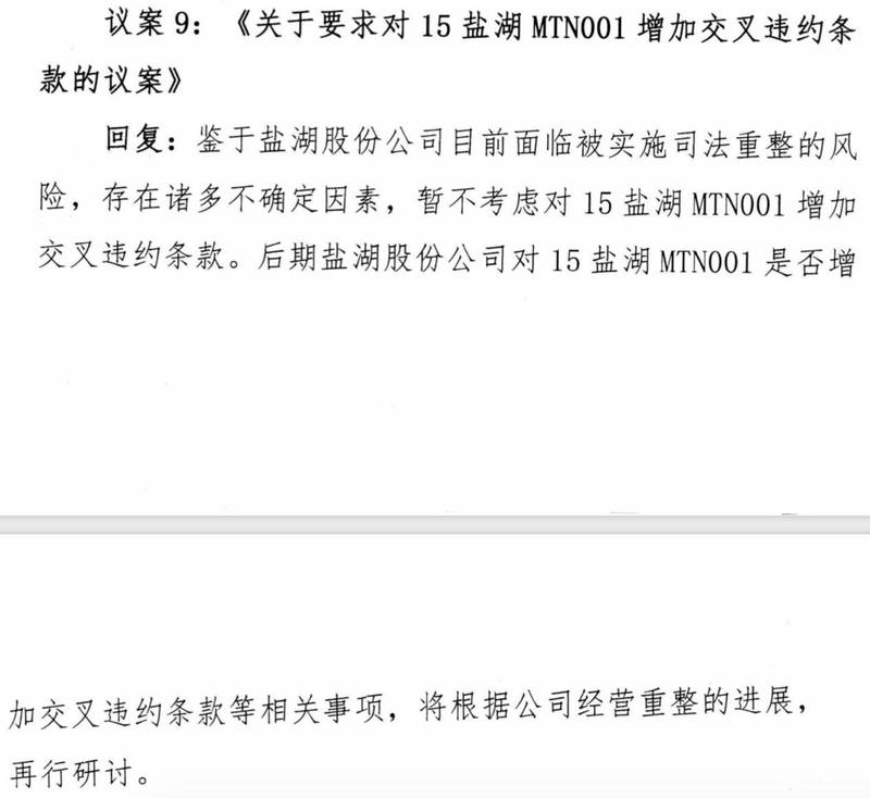 对于议案9《关于要求对15盐湖MTN001增加交叉违约条款的议案》,盐湖股份称,鉴于盐湖股份目前面临被实施司法重整的风险,存在诸多不确定因素,暂不考虑对15盐湖MTN001增加交叉违约条款。