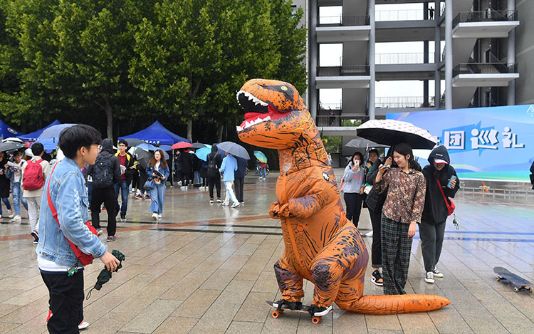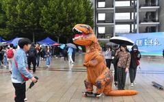 身穿恐龙装的滑板社团老社员正在招揽新社员。