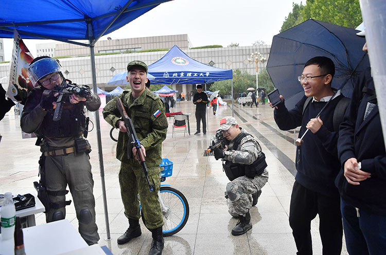 军事爱好者社团展示精良的装备,吸引了男生的目光。
