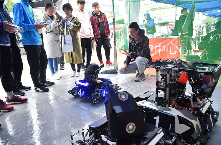 机器人社团展示的“步兵机器人”、“英雄机器人”吸引了众多同学围观。
