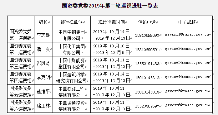 10月16日,国务院国有资产监督管理委员会官网披露:国资委党委巡视组进驻6家央企开展2019年第二轮巡视。