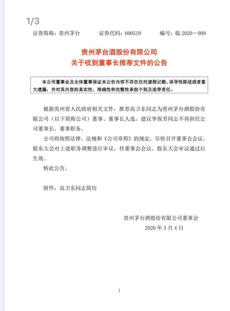 新京报讯(记者 郭铁)3月3日晚,贵州茅台发布公告称,根据贵州省人民政府相关文件,推荐高卫东为贵州茅台酒股份有限公司(以下简称“贵州茅台”“股份公司”)董事、董事长人选,建议李保芳不再担任贵州茅台董事长、董事职务。