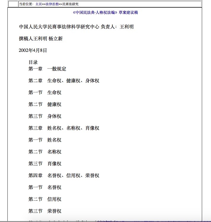 2002年4月,由王利明、杨立新等人撰写的人格权编专家建议稿。网站截图