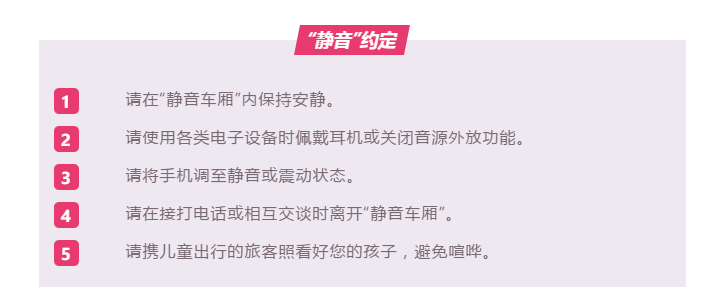 12月23日(明天)起,旅客通过铁路12306网站、手机App、自动售票机等渠道购买京沪高铁、成渝高铁指定车次车票时,如需提供“静音车厢”服务,可根据系统提示自愿选择购买“静音车厢”车票,“静音车厢”设在3号车厢(二等座车)。旅客乘坐“静音车厢”时,请配合遵守“静音”约定。