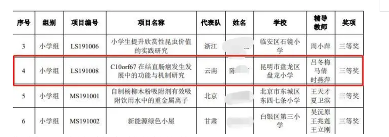 无独有偶,就在今年7月,昆明市一位六年级小学生开展的结直肠癌相关研究获得全国大奖,同样引来网友的大范围议论。这篇出自小学生之手的研究报告有着研究生论文一样学术范儿十足的标题:《C10orf67在结直肠癌发生发展中的功能与机制研究》,它作为云南代表队参赛作品,获得了第34届全国青少年科技创新大赛三等奖。然而,研究的复杂性明显超过一位小学生的知识水平,舆论对此报以的显然不会是对“后浪”潜力无穷的称赞,而是认为这是一次由幕后家长作为推手的学术造假行为。据新京报记者了解,该大赛获奖者,可在高考投档时获得不超过20分的加分,自主招生时同等条件下会优先考虑。