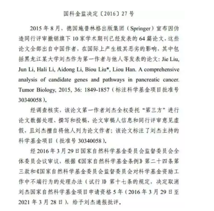 Springer出版集团在2015年撤稿64篇,论文作者均来自中国。