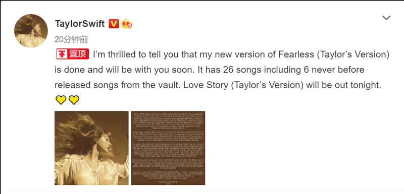 新京报讯 北京时间2月11日晚,泰勒·斯威夫特在社交媒体发文,透露重录版专辑《Fearless》将于4月9日发行,重录版收录了26首歌曲,其中包括6首此前从未发行过的歌曲,并一同发布了重录版专辑《Fearless》的封面。此外,泰勒·斯威夫特还透露,重置版《Love Story》将于明日发行。