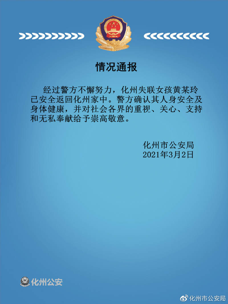 新京报快讯 据@化州市公安局微博2日消息,经过警方不懈努力,化州失联女孩黄某玲已安全返回化州家中。此前,有媒体报道,22岁女大学生黄某玲失联6天。3月1日,黄某玲的弟弟告诉记者,2月23日,黄某玲回外婆家,半小时后离开至今未回。家属一度怀疑黄某玲是被“拐”走的。警方确认其人身安全及身体健康,并对社会各界的重视、关心、支持和无私奉献给予崇高敬意。