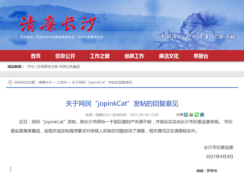 新京报快讯 4月4日,长沙市纪委监委网站发布《关于网民“jopinkCat”发帖的回复意见》。回复意见称,近日,网民“jopinkCat”发帖称长沙市政协一干部巨额财产来源不明,并就此实名向长沙市纪委监委举报。长沙市纪委监委高度重视,按相关规定和程序要求对举报人反映的问题启动了调查,相关情况正在调查核实中。