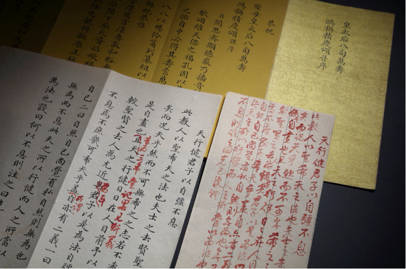 乾隆御制文《天行健君子以自强不息》朱稿及墨稿朱批(前);崇庆皇太后八旬万寿祝寿颂词册页(后)。
