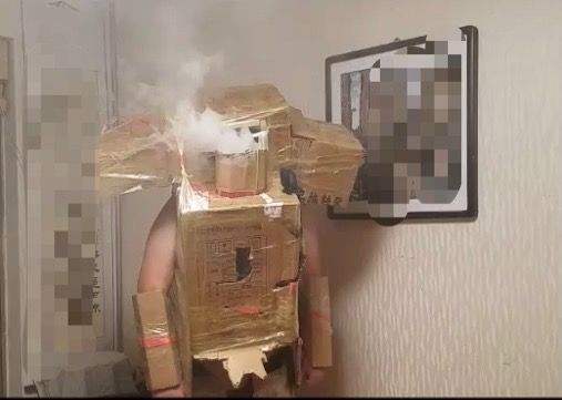 2018年,小辉模仿游戏,用家里纸箱制作的铠甲。受访者供图