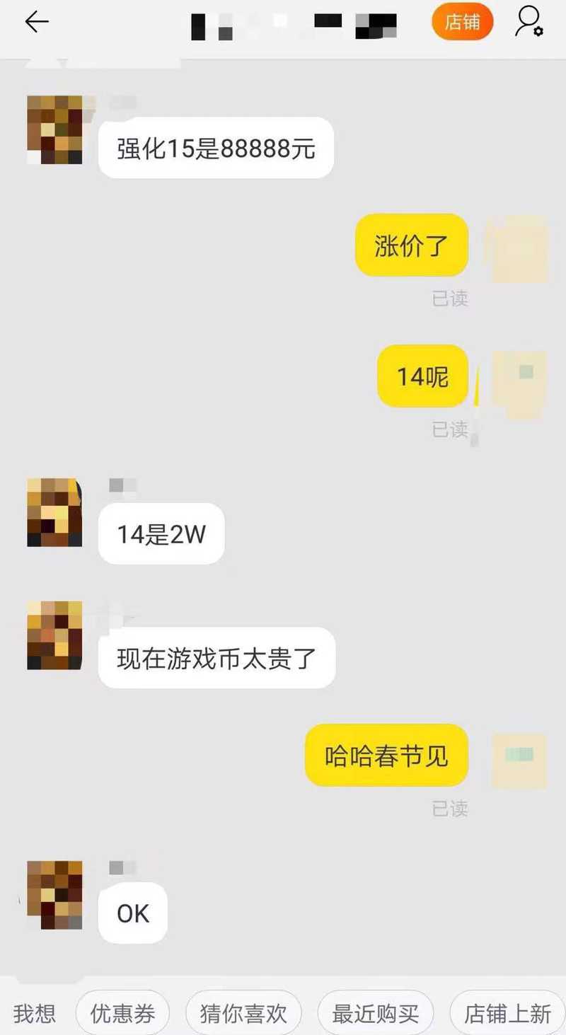 2019年,江欣登陆小辉的淘宝账号,看到小辉与客服联系,想在2019年春节花钱找人代打游戏等级。受访者供图