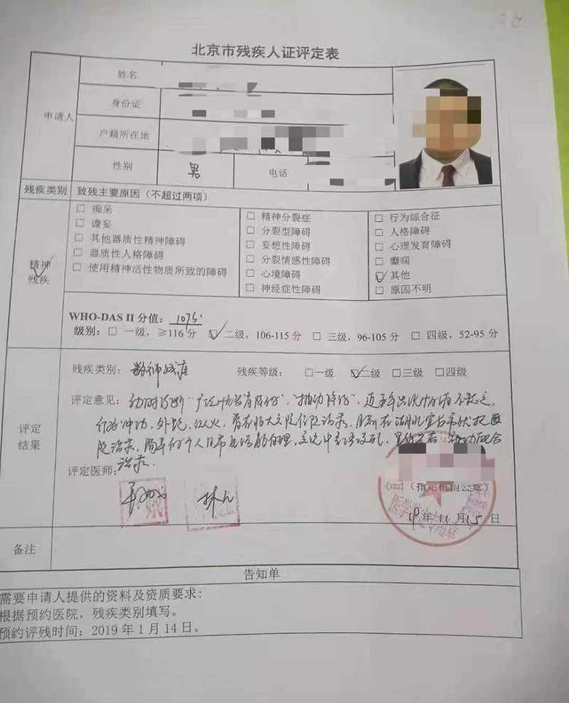 在北京市残疾人证评定表中,显示小辉被评定为精神残疾二级。