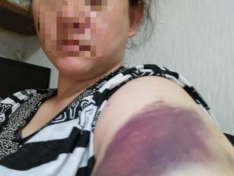 2018年,因为阻止小辉玩游戏,江欣左臂被小辉打伤,深紫色淤青明显。受访者供图