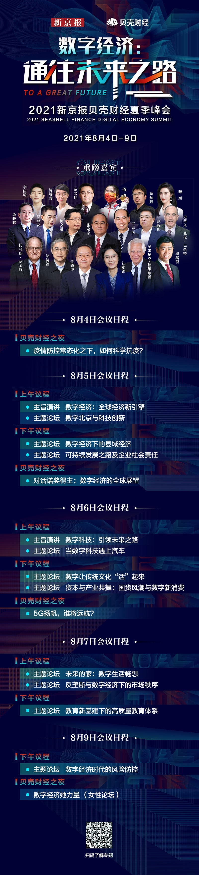 今年夏天,我们带着一份数字经济的思想大礼,破浪而来。8月5日,2021新京报贝壳财经夏季峰会——“数字经济:通往未来之路”将盛大启动,在为期5天的时间里,16场高质量的主题演讲和圆桌论坛将会一一呈现。