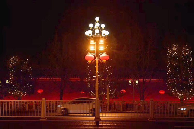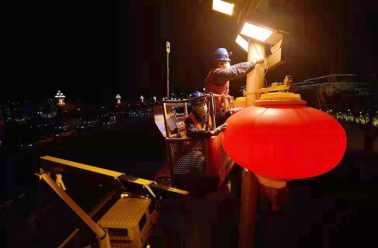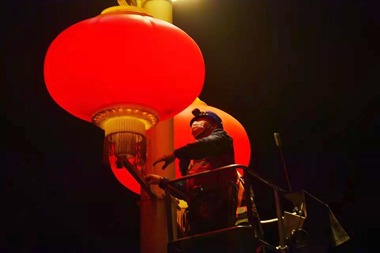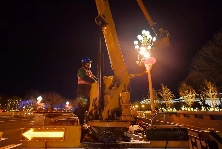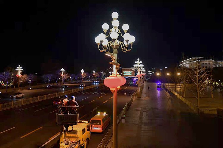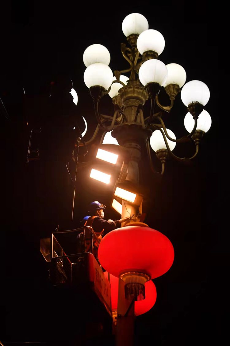 1月15日晚,随着春节、北京冬奥会的日益临近,为了在春节期间扮靓“双奥之城”,按照北京市城管委统一部署,国网北京电力城市照明管理中心正式启动2022年长安街春节景观布置工作。“中国风”十足的大红灯笼和中国结将于1月20日提前点亮,届时为首都市民及世界各国运动员带来一个喜庆热闹、与众不同的北京冬奥会。图为:长安街石碑胡同路口,电力高车停在华灯下准备施工。