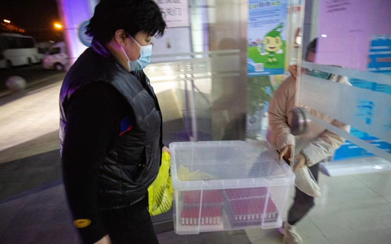 六楼,出电梯顺着楼道拐三个弯,实验室出现在眼前。两位戴着N95口罩的工作人员提着一个收纳箱步履匆匆。实验室外,海淀区疾控微生物检验科纪黎黎等在办公室门口,收下这批新采回的样本。