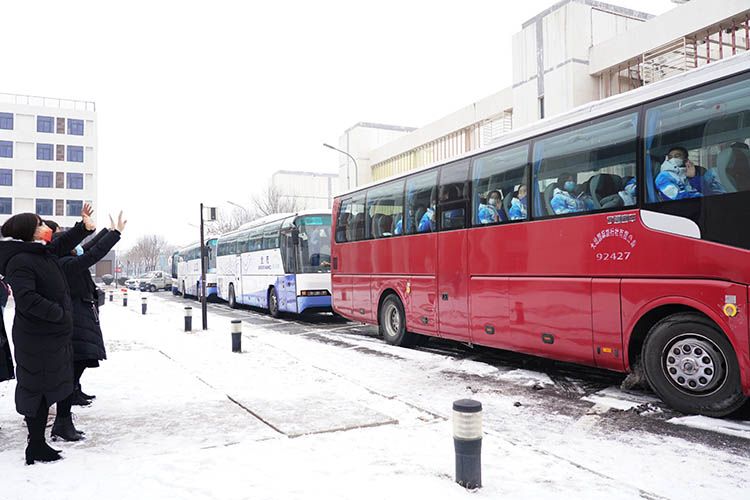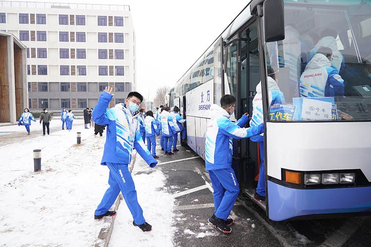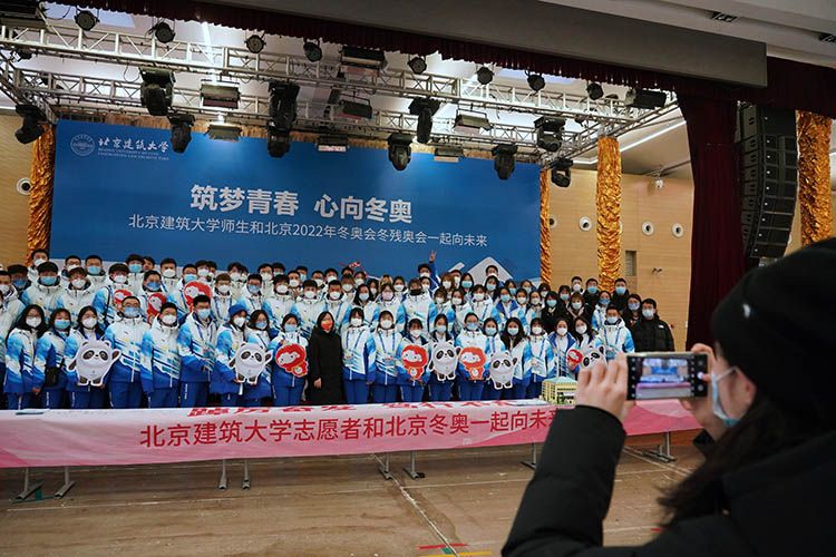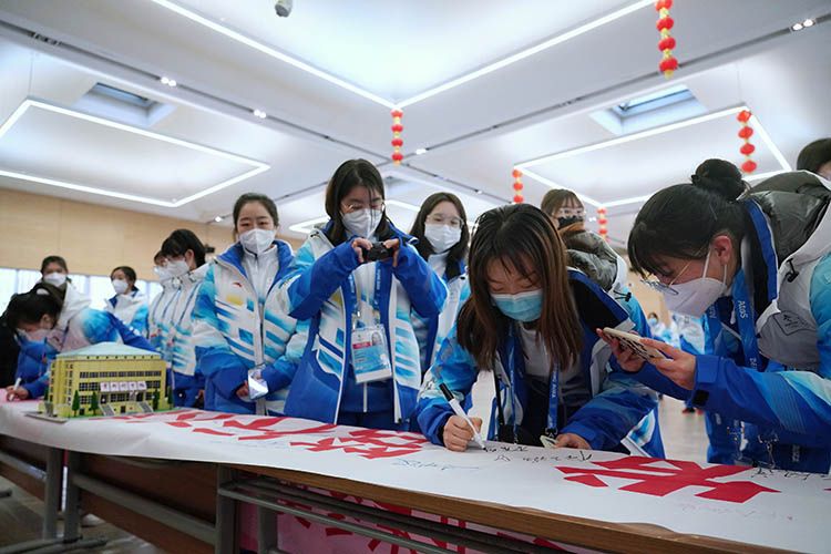 1月23日,北京建筑大学北京2022年冬奥会志愿服务队正式出征。91名志愿者将在场馆管理、人员管理、体育通行控制(花样滑冰)、体育通行控制(短道速滑)、交通、礼宾服务、赛事服务、志愿者以及场馆通行控制9个业务领域志愿服务岗位全程服务。图为:志愿者们在“一起向未来”出征横幅上签下自己的名字。