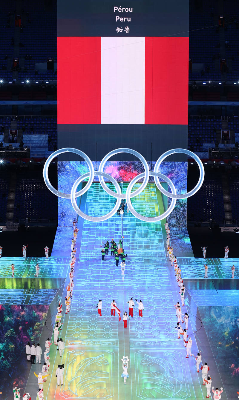 秘鲁代表团入场,该代表团旗手将参加高山滑雪比赛。图/新华社