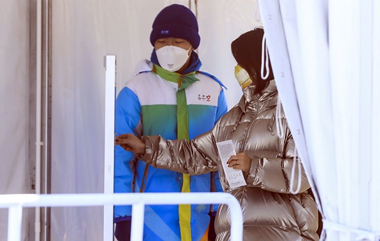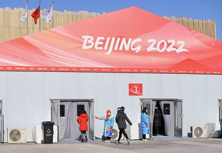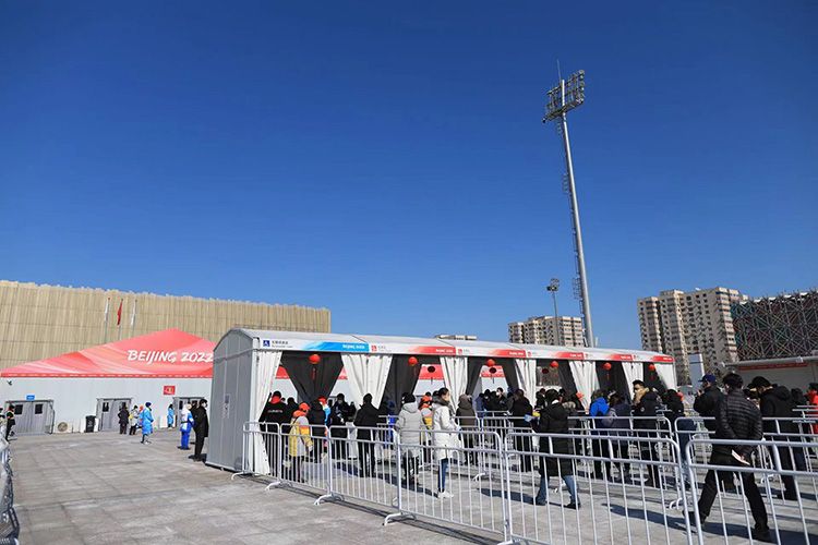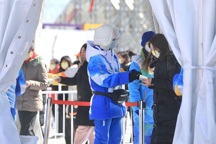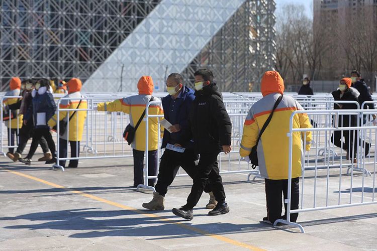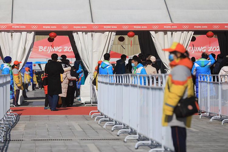 北京冬奥会比赛激战正酣,新京报记者探访场馆外服务。在五棵松体育馆,全息凝视摄像机和安全服务机器人都已配置“上岗”,外围保障组的工作人员与志愿者也全部进入“赛时”状态。图为:观众在志愿者引导下有序安检进入外围场馆。