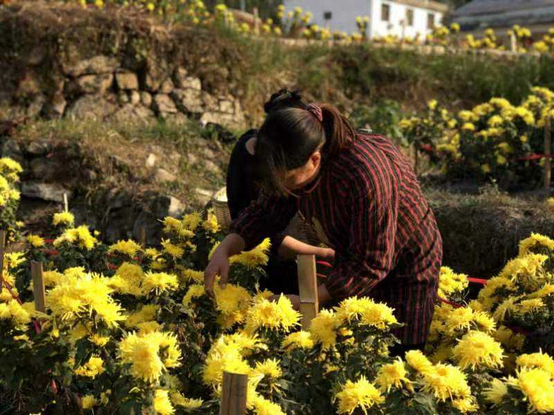 因为主打生态农业,为追求独特的品质,万涧村的金丝皇菊,在种植过程中不使用农药、化肥,选择了纯人工种植养护,这对万涧村参与金丝皇菊产业的村民有着极大的考验。于是,每到金丝皇菊的采摘季,都能在田野里看到涧行者的身影。杨媛珍说:“我们的成员都是进行农业作业的好帮手,到丰收的季节,妇女就会成为采收的主要力量。”