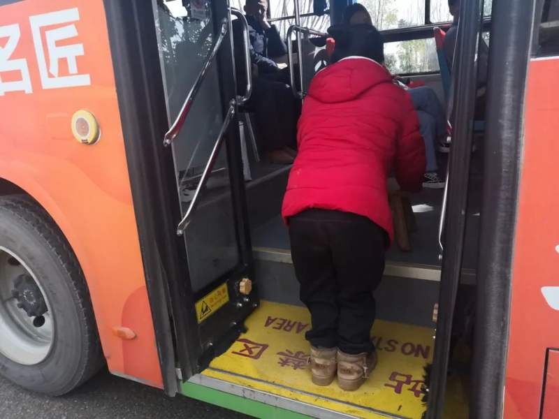 陈新平先把板凳放到公交车门的最下一级台阶之上,靠两条胳膊撑起整个身体,两条腿被上半身带着向前,爬上一级,再重复一样的动作,整个过程差不多两分钟。
